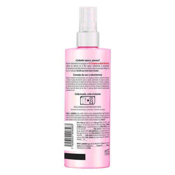 ¿Cabello opaco y poroso? Recupera el brillo de tu cabello con nuestro Tratamiento con enjuage ULTRA GLOSS con 6% de concentración de [COMPLEJO CON ÁCIDO GLICÓLICO], Conoce la innovación Elvive Glycolic Gloss, su poderosa acción rellena los defectos de la fibra capilar, combatiendo la porosidad debido a su pH ácido que lamina la cutícula para reflejar mayor luz. En un solo uso: Un brillo que resiste hasta 6 lavadas°, utilizando la rutina completa. Después de aplicar el acondicionador, no lo enjuagues. Divide el cabello en 4 partes y utiliza el spray directamente sobre el cabello, cubriéndolo de largos a puntas. Extiende el producto por el cabello con las manos. Deja actuar 5 minutos y enjuaga. Se recomienda su uso 2 veces por semana, o cuando quieras intensificar el brillo.
